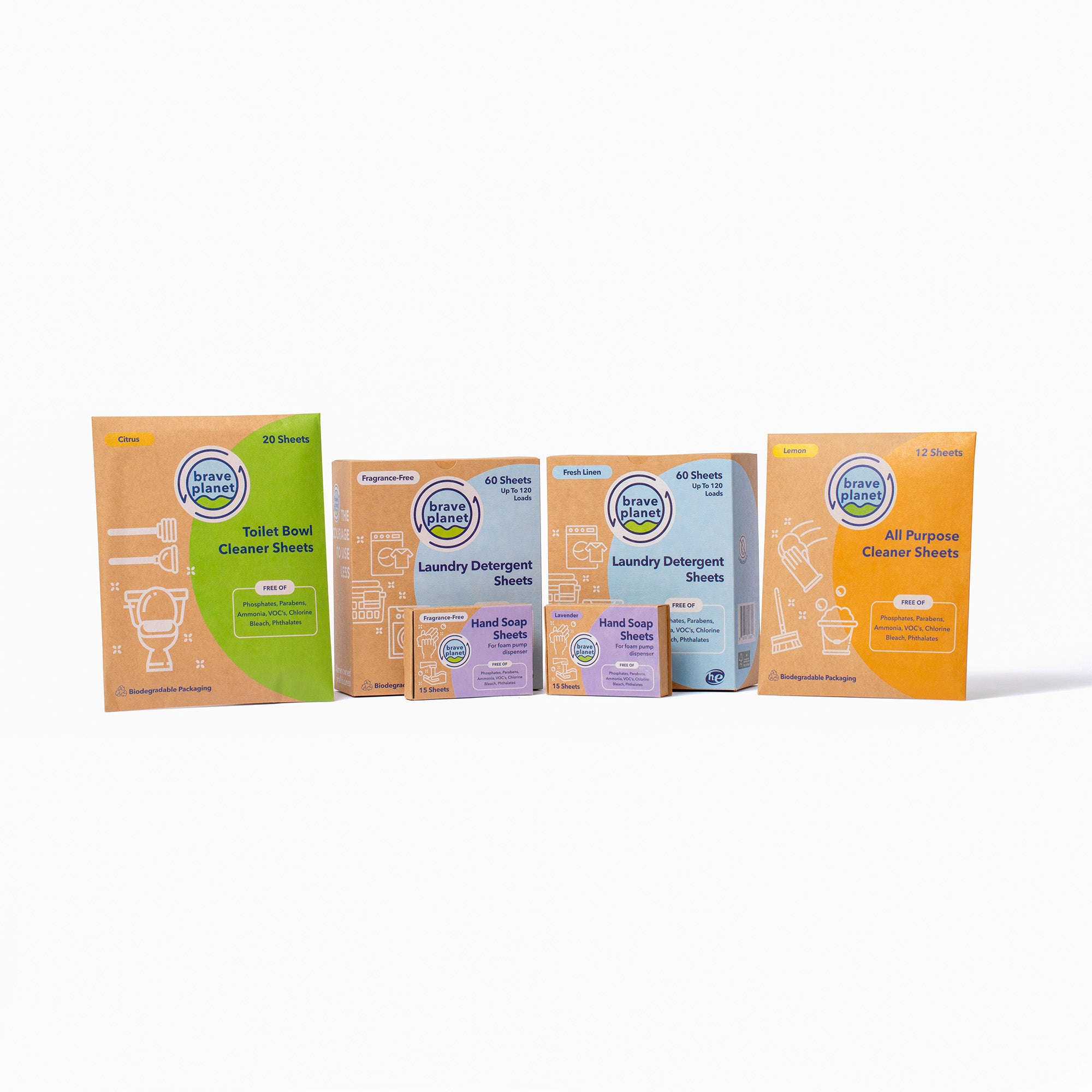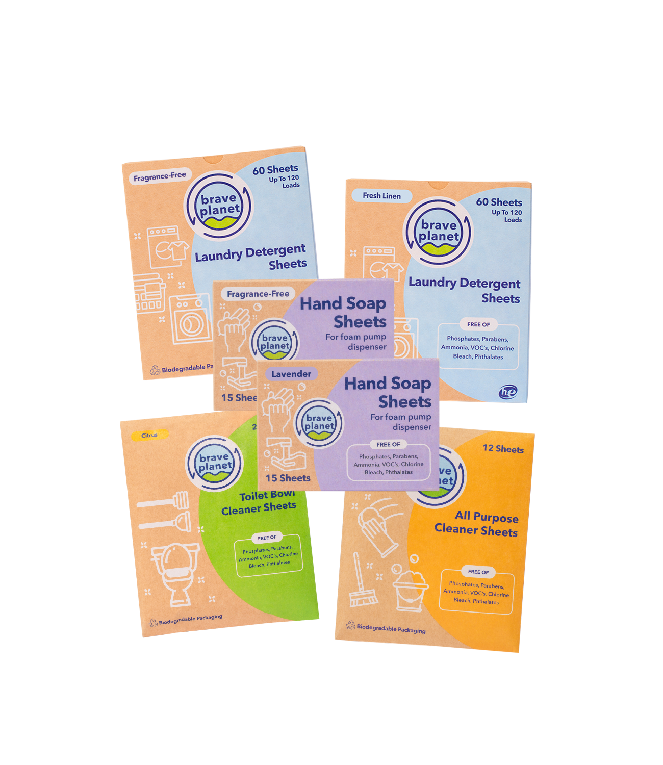 We offer a more convenient, eco-friendly alternative to traditional cleaning products. The active ingredients found in traditional liquid or powder detergents and cleaners – such as laundry detergent, all-purpose cleaner, hand soap, and toilet bowl cleaners -- are dehydrated and infused into thin, biodegradable sheets.